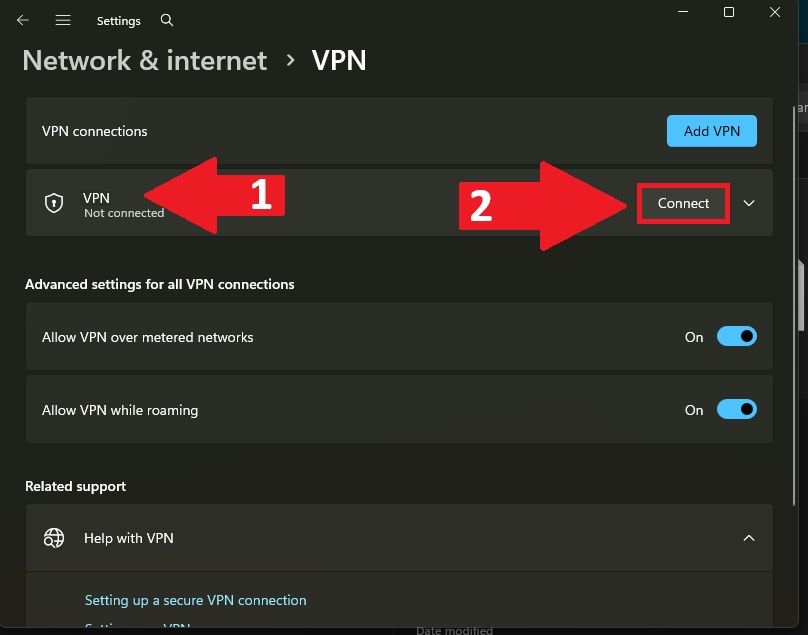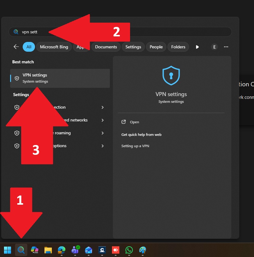windows meklēšanā ierakstam ''vpn vai vpn settings''